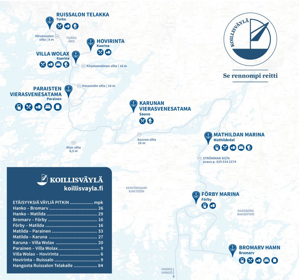 Maltillisten tuulten ja pienen aallokon väylä kulkee Bromarvin, Förbyn, Mathildedalin, Karunan, Paraisten, Villa Wolaxin, Hovirinnan ja Ruissalon Telakan idyllisten satamien kautta. Reitin varrella odottavat viihtyisien vierasvenesatamien ravintolat ja kahvilat, jotka tarjoilevat saariston makuja mereltä ja lähitiloilta sekä parhaita makunautintoja maailmalta.